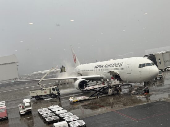 自分が乗る飛行機も翼の雪おろしと、